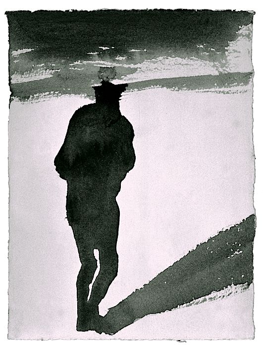 The drawings consider light as energy and body as space. The relationship of container and contained (whether by water, earth or light) is explored  in medium and imagery: the body's relationship to another body; the relationship of the body to the Earth; falling bodies and foetal forms identified by a penumbra of light, floating in darkness or enclosed a single line, floating in light.