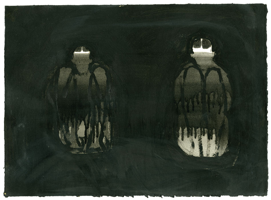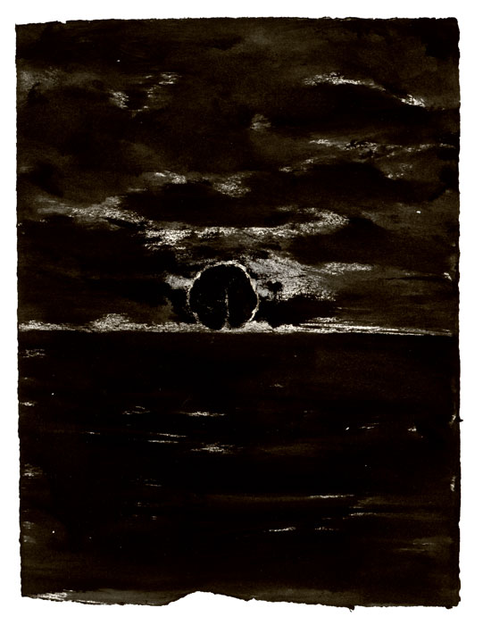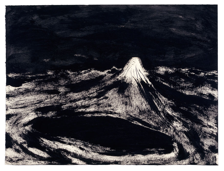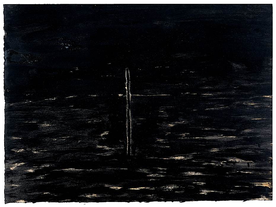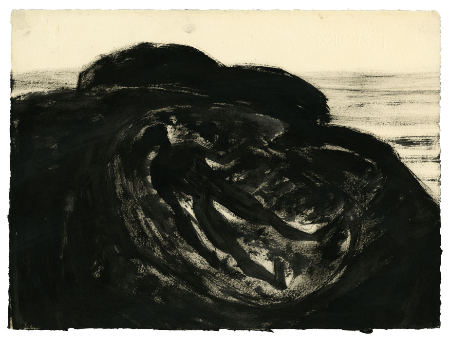 'These black pigment, oil and charcoal drawings made between 1985 and 1988 and generally on a smaller scale, were executed on a heavy density etching paper, Somerset Weave, which Gormley first discovered as a support in 1984 and which he has consistently used since. Large sheets of paper were folded and torn to scale, either in quarters, sixteenths or more generally, as in this case, eighths. Either way, the uneven edges were left uncut, complementing the coarse but highly atmospheric ground texture provided by the dense weave of the paper. This highly productive period in Gormley's drawing career when he found himself working, sometimes "for hours at a stretch in a frenzy", is characterised generally by a pervasive blackness. The first drawings were made while staying near Tintagel, a historical, windswept shoreline in north Cornwall, mythically connected by its castle to the legend of King Arthur. The imagery of hot rock pools, seascape, sheer cliff and night sky relates specifically to the place and suggests its very particular atmosphere. The rest of the drawings were made in the drawing room of a new studio converted from an old laundry in Peckham, South London. The physical darkness of these drawings contributes to a melancholic gravitas in terms of atmosphere and tone, paralleling the dark interior of Gormley's lead sculptures.'