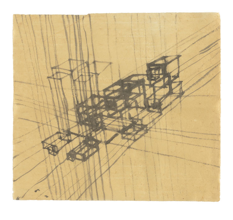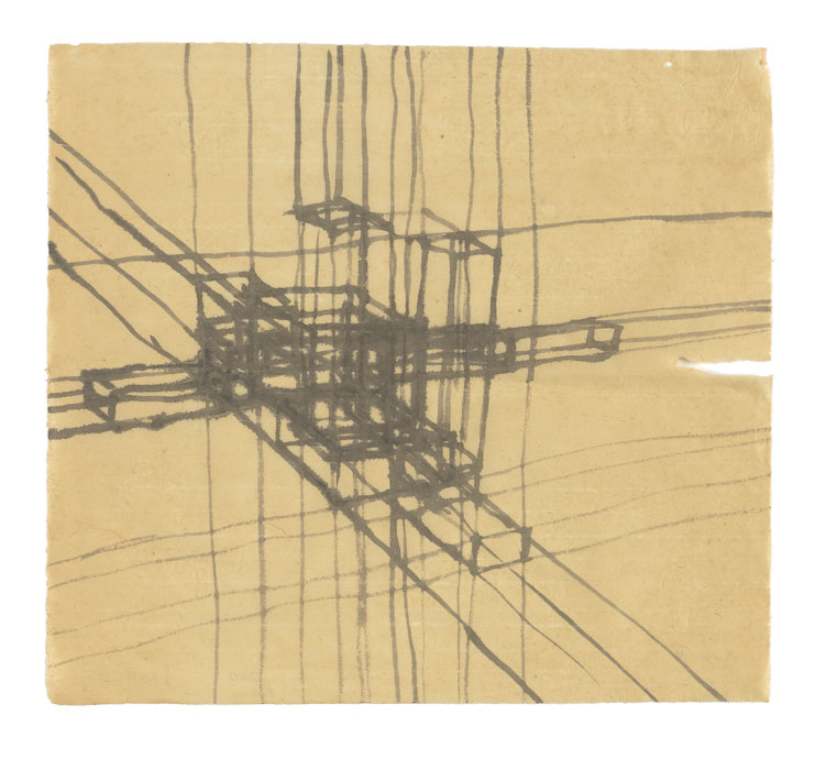 'The thing for me here is how the "defining" nature of architectural drawing that suggests an absolute measure of a place in space can be made free by continuing the delineation. Far from fixing the image, it suggests that the body space is a possible space within space at large and could be underground, above ground or anywhere. The paradox that in attempting to "define" an absolute crystalisation of human space in space, it ends up floating in indeterminacy.'