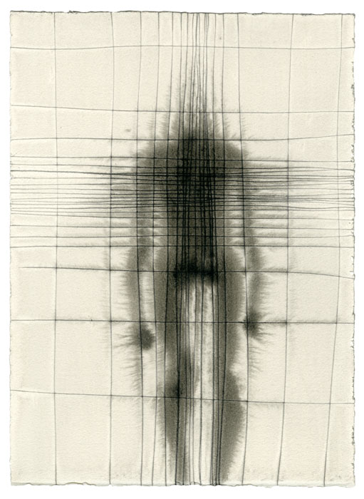 All of the drawings in the ZONE series are made by scratching with an etching burin in a sheet of paper that has been previously soaked with a light carbon and casein wash - sharp lines made directly into wet paper. The scratches absorb the surrounding pigment and water at a faster rate than the unscratched areas, sometimes forming a halo or penumbra around the line.
