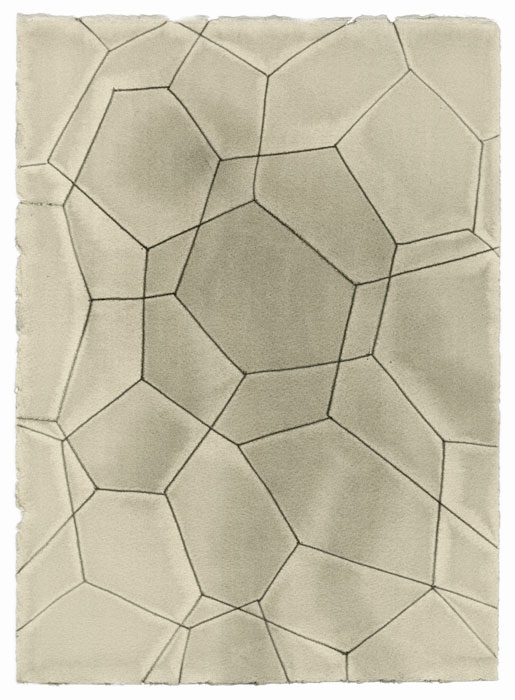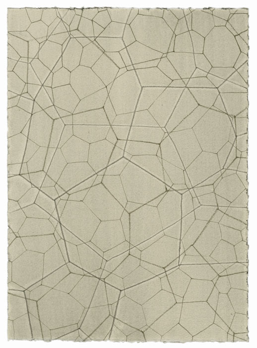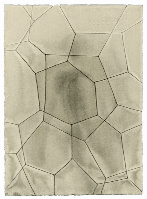 Like the ZONE drawings, they are made by scratching with an etching burin into a sheet of paper that has been previously soaked with a light carbon and casein wash: sharp lines made directly into the wet paper. The scratches absorb the surrounding pigment and water at a faster rate than the unscratched areas, sometimes forming a halo or penumbra around the lines.