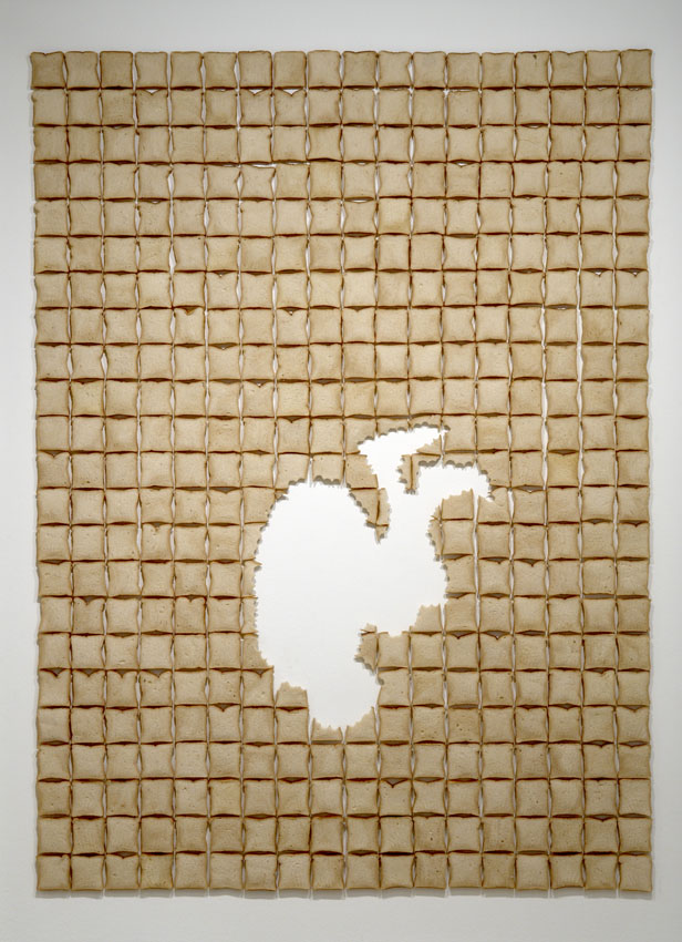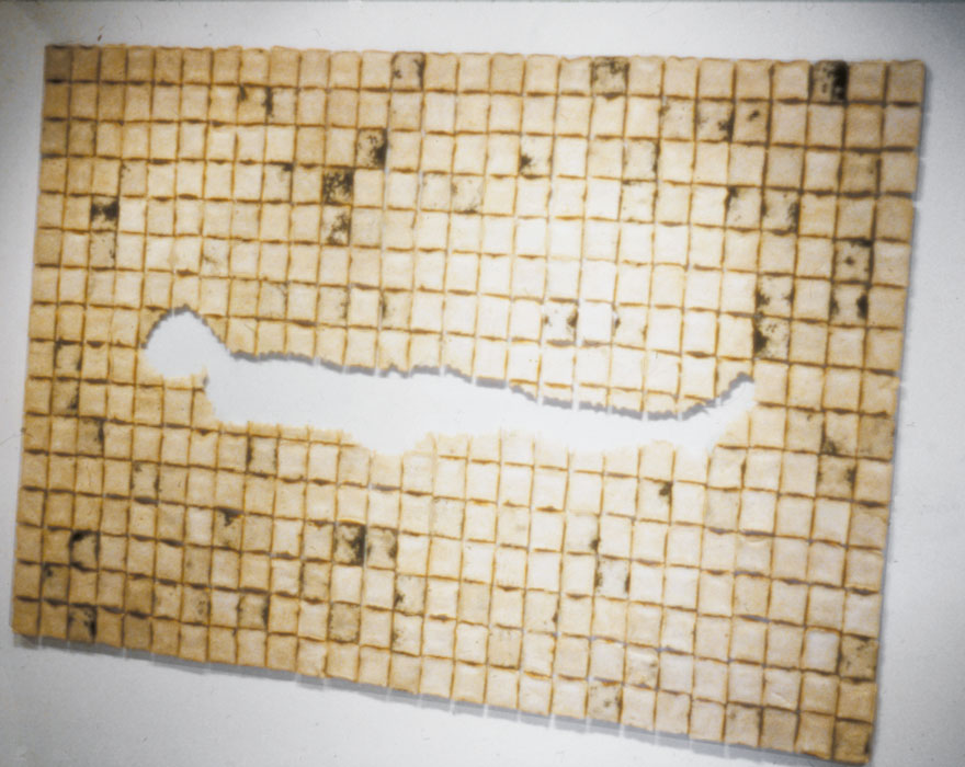 Bread and settled human life go together. BREAD LINE is a measuring of life, the distance we go, the distance we travel in a body, a moment at a time. Bites of bread laid out on the floor, footprints in the snow, bites in bread, traces in time.