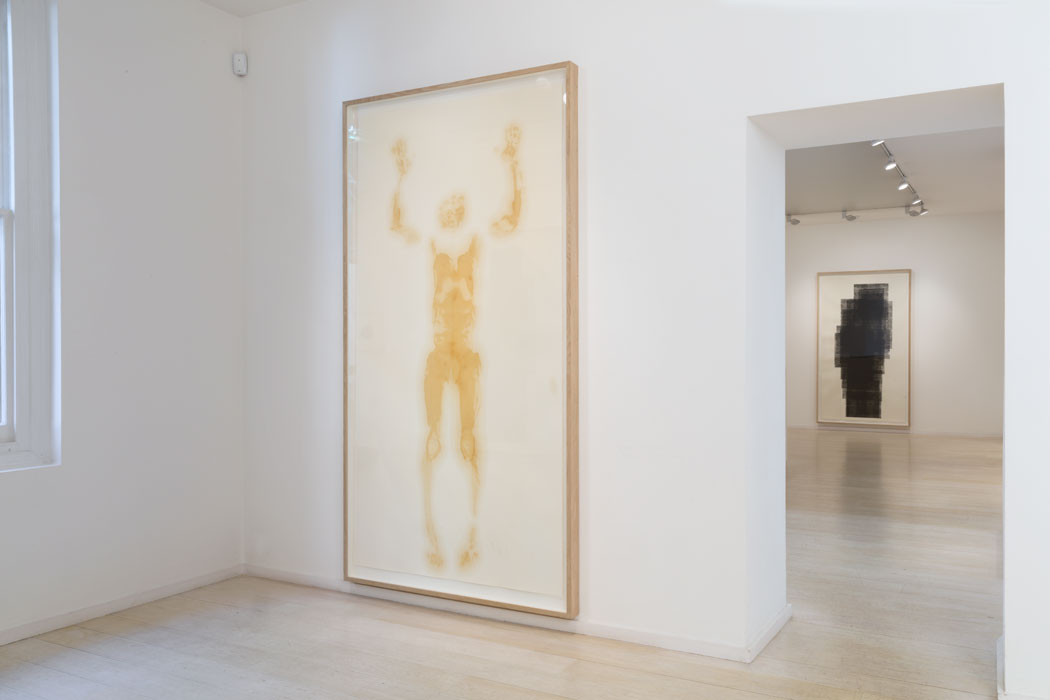The 'Woodblocks' are interspersed with a series of crude oil and petroleum jelly 'Body Prints'. The transfer is achieved by Gormley falling directly onto the paper, the weight of his body leaving a corresponding print. The sacral use of crude oil as representative of the 'blood of the earth' highlights our dependency on the planet's solar memory.